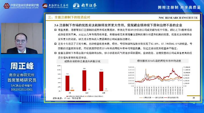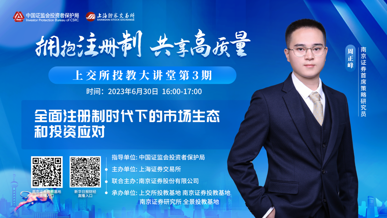本次活动由南京证券首席策略研究员周正峰老师为投资者带来《全面注册制下的市场生态和投资应对》主题直播。周老师有多年宏观策略研究经验,主要从事宏观策略及大类资产配置研究工作,经验丰富。周老师从全面注册制是金融供给侧改革的重要一环、全面注册制将如何改变市场生态和全面注册制下的投资策略三个角度帮助投资者深化对全面注册制改革内容和内涵的理解,了解全面注册制带来的投资机会和投资风险,更好地参与、支持和配合市场改革与发展,成为与全市场注册制相适应的投资者。