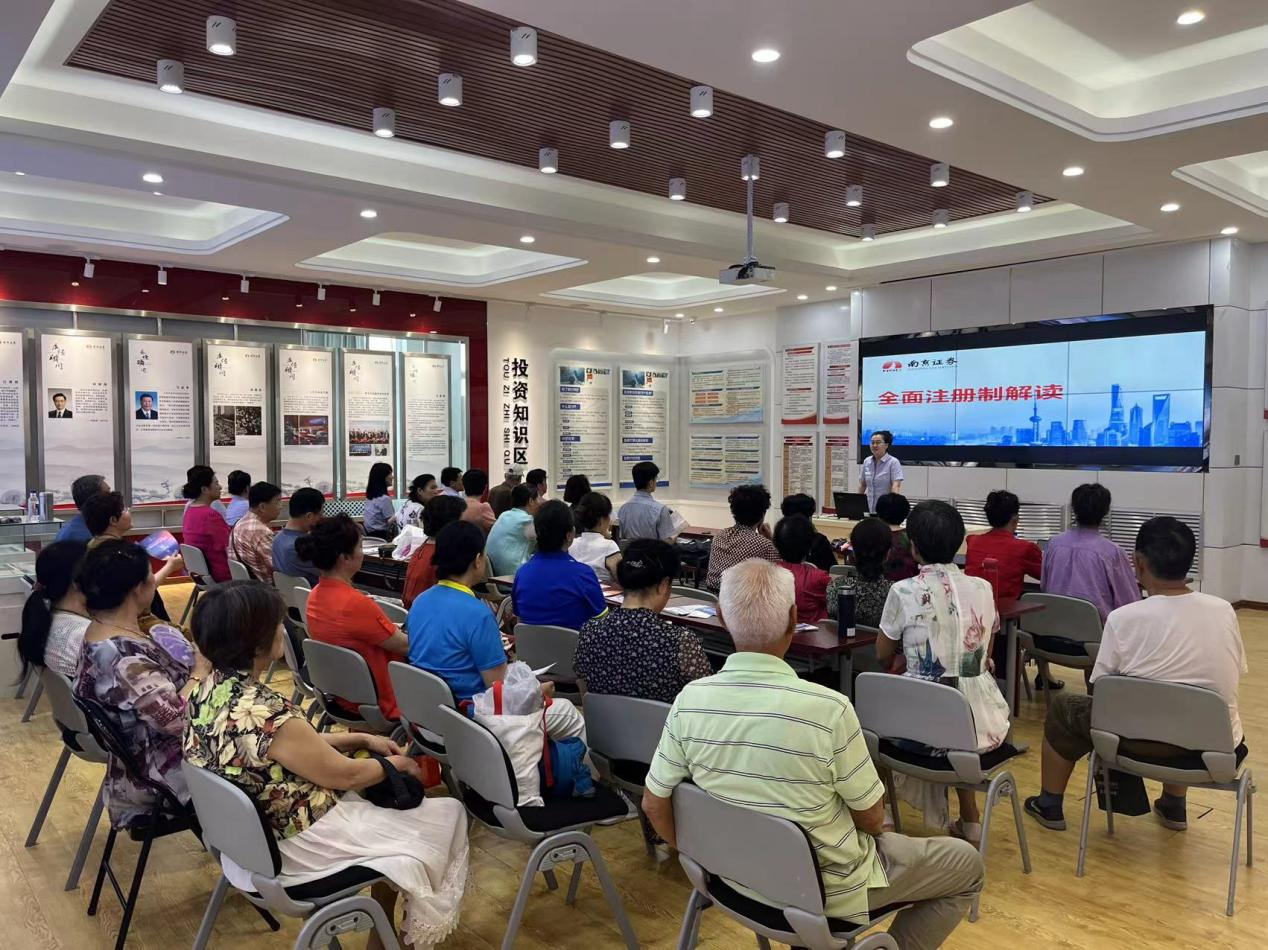 为深入做好知识普及、规则讲解和风险提示工作,助力市场平稳运行,2023年7月31日,南京证券投教基地以开展全面注册制专项投教活动为契机,联合银川文化东街证券营业部开展了主题为“全面注册制解读”的专项讲座,向40余名投资者讲解了注册制交易规则和注册制下主板投资风险。