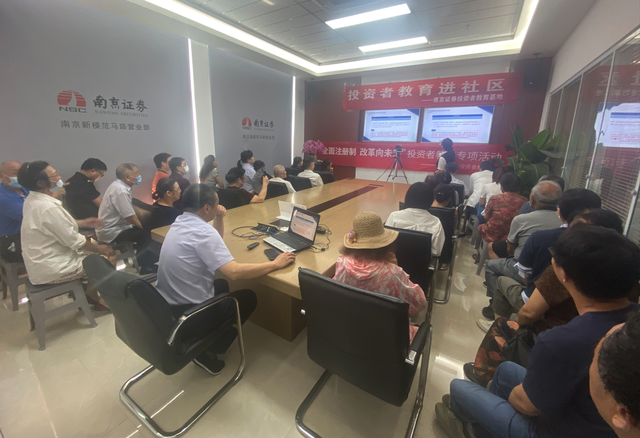 为做好全面实行股票发行注册制投资者教育保护工作,维护广大投资者合法权益,增强理性投资的意识,2023年8月23日,南京证券投资者教育基地联合南京新模范马路证券营业部,邀请中央门街道将军庙社区群众来到营业部现场,开展“全面注册制 改革向未来”为主题的全面注册制投教专项活动。