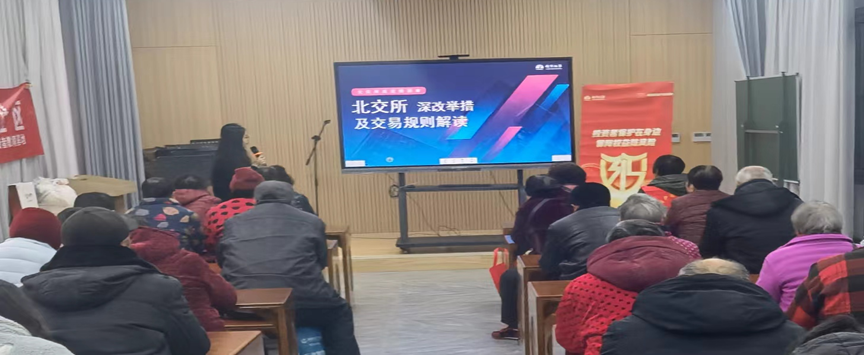 活动当天,讲师通过投放PPT进行了北交所深改举措及交易规则解读,主要从《关于高质量建设北京证券交易所的意见》要点、北交所深改创新举措、北交所交易规则这三个方面进行讲解,使社会公众更好的了解了北交所的相关知识;通过电视投屏进行了违规出借证券账户案例分析、虚假网络投资理财类诈骗三步骤、证券市场虚假陈述投资者权益保护连连问—司法解释新发展的宣传,并通过发放宣传单页,告知如何远离洗钱活动,从而保护自己,宣讲了《反电信网络诈骗法》金融治理三道安全防线,警惕一些诈骗手段,以及通过反洗钱典型案例剖析进行警惕洗钱陷阱,保护自身利益的宣传,告知投资者该怎样保护自己、远离洗钱,做好安全防线,提高群众法律意识,警惕非法证券活动。