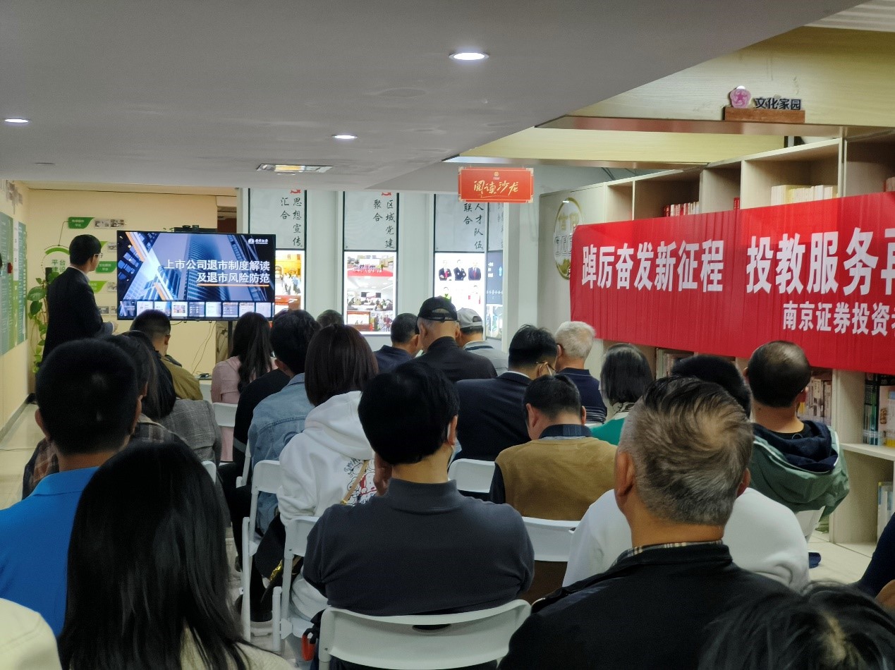 为进一步加强投资者教育,切实保护投资者合法权益,普及金融知识,宣传防范非法证券活动,增强投资者理性投资意识,南京证券投教基地联合昆明人民西路营业部于2024年3月28日,走进西山区六合社区举办了投教知识宣传走进社区活动,开展了一场别开生面的“反洗钱在身边”与“上市公司退市制度解读及退市风险防范”的社区投资者教育活动。与会成员主要为六合社区辖区内各机关单位党支部代表成员,其中包括棕树营派出所、明诚公证处、不动产登记中心等单位的党员代表,以及部分社区群众。
