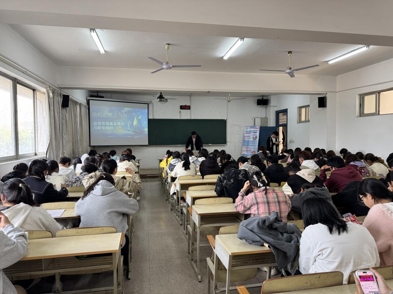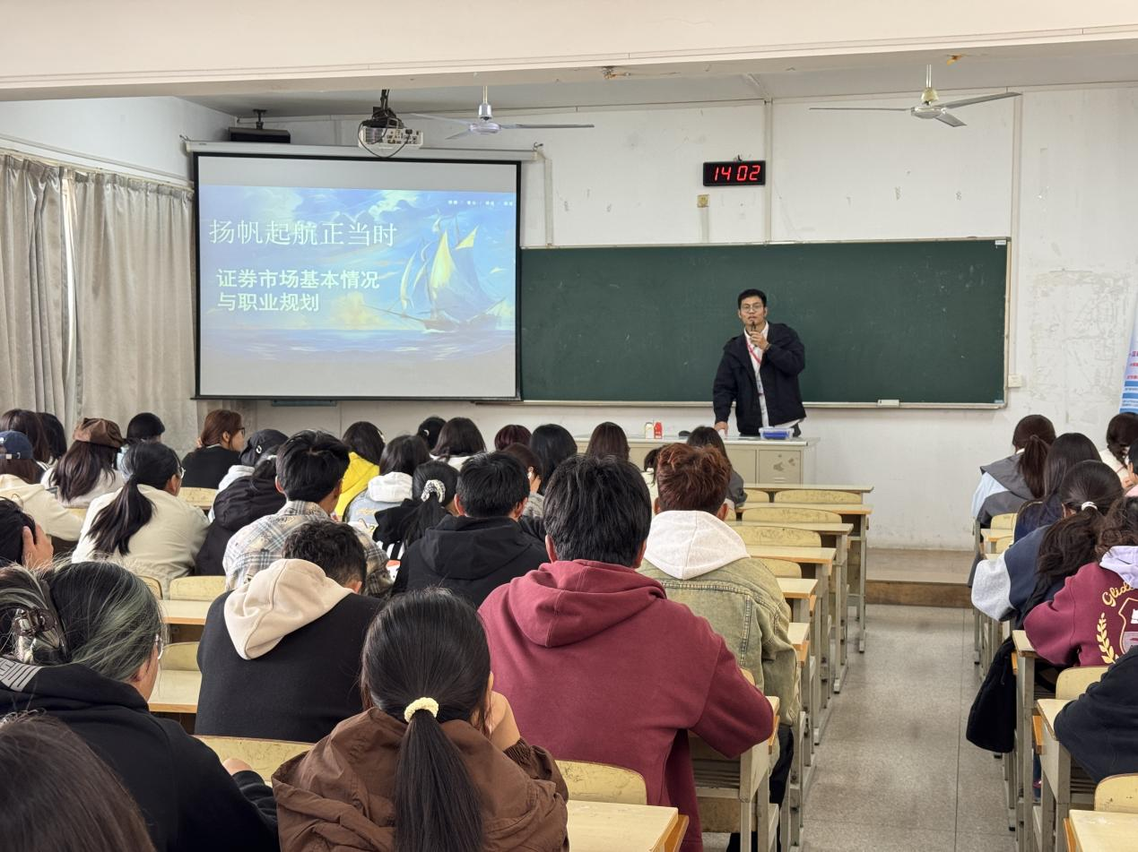 当天下午,讲师为在校学生进行了金融知识普及讲座。讲座中,讲师向同学们详细讲解了金融知识、证券市场的发展历程,并提醒同学们投资的风险,通过风险自测让大家充分了解各自的风险承受能力,引导学生根据自己的能力合理配置不同的理财产品,理性投资。此外,讲师还向同学们详细讲解了证券市场的职业规划,层层讲解职业规划的关键环节,聚焦行业调研与目标岗位分析,通过解读热门行业趋势、拆解岗位核心需求,帮助同学们打破信息差,让规划更贴合市场实际。