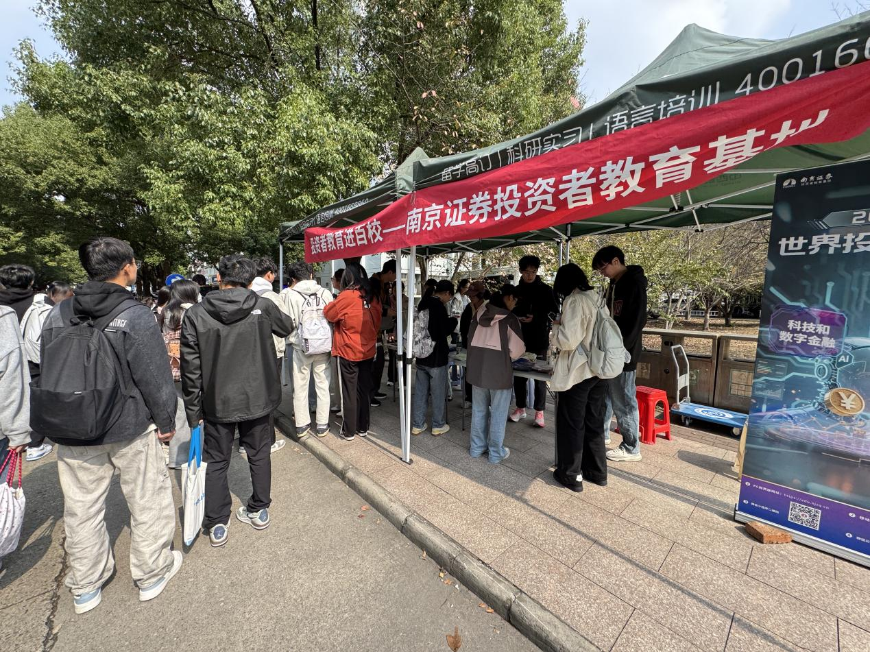 活动当天上午,南京证券投教基地在校园内搭展台,向来往大学生分发折页和小礼品,宣传防范电信网络诈骗,呼吁同学们提高警惕,增强反诈意识。