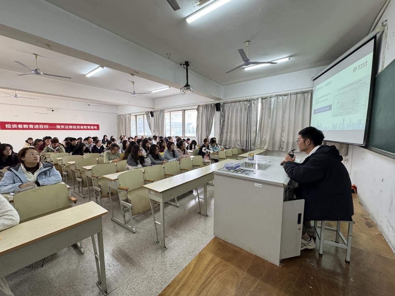 为积极响应中国证券业协会“四合一”机制、“投教进百校”等校园投教活动倡议,进一步推进投资者教育纳入国民教育体系进程,提高大学生金融素养,培养大学生的金融意识、风险意识,树立理性投资观念,2025年10月27日,在2025年世界投资者周期间,南京证券投教基地联合常州花园街证券营业部走进江苏理工学院,以“扬帆起航正当时”为主题开展了投资者教育进百校活动,近150名学生参与了此次活动。