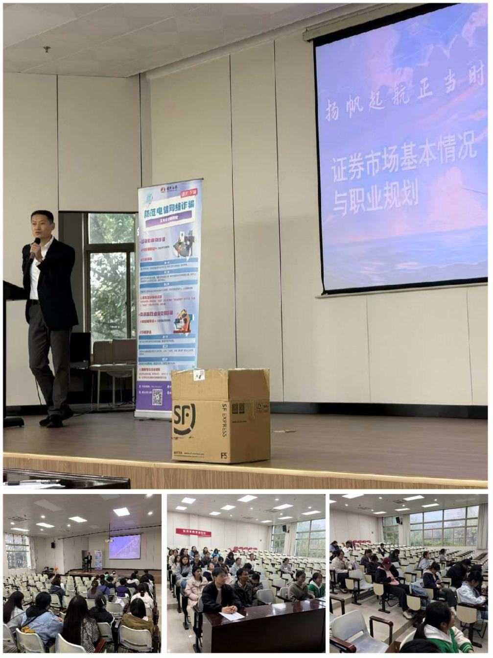 活动中讲师向同学们讲解了中国证券市场发展史、职业规划及人才需求,向同学们普及了证券知识,让同学们了解资本市场的发展动态和成果,也为同学们未来的投资之路奠定了基础。同时,讲师讲解了校园贷和金融诈骗的基本特征及防范要点,提高学生识别和防范能力。