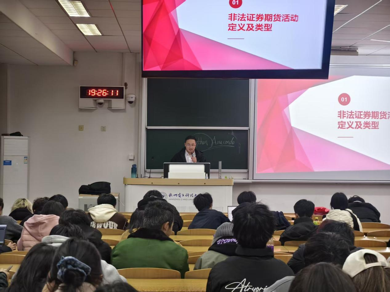 为积极响应中国证券业协会“四合一”机制、“投教进百校”等校园投教活动倡议,切实提升高校学生群体对非法金融活动的识别与抵御能力,2025年12月19日,南京证券投教基地联合杭州新塘路营业部走进杭州电子科技大学,成功举办了一场以“如何识别非法证券期货活动”为主题的金融安全知识讲座。活动吸引了120余名在校学生积极参与,现场学习氛围浓厚。