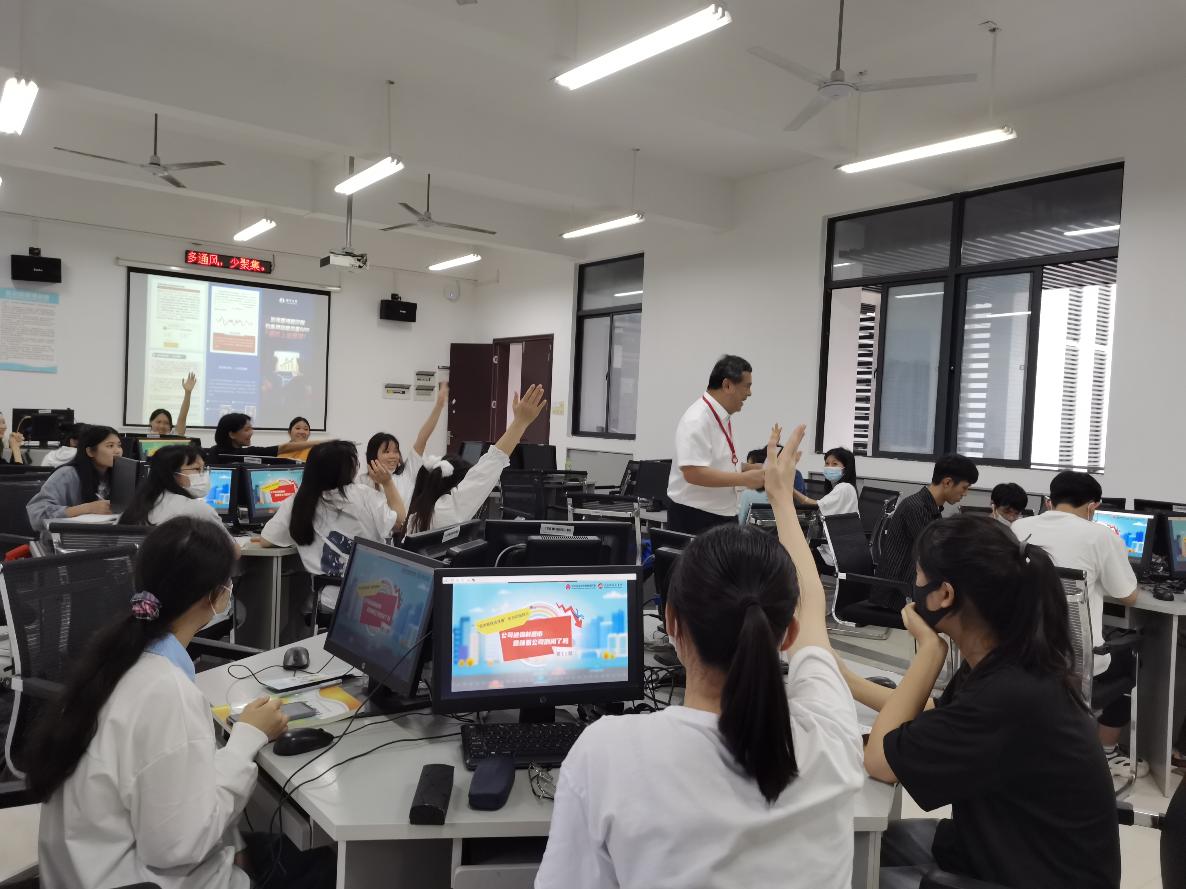 本次活动共计51名来自证券与期货专业2001班的师生参与,活动以投教基地原创课程“大学生初识投资理财”作为开场,接着营业部讲师韦琦还围绕“防范非法证券期货活动”和“非法校园贷风险解析与防范”两个主题展开介绍,详细阐述了证券期货市场发展基本情况、退市新规、非法证券期货活动的基本特征、如何警惕和识别钓鱼网站和仿冒APP等金融知识;宣讲既深入浅出地分析了理论重点,又紧扣当代大学生的心理特点,通过生动形象的案例,帮助同学们进一步增强了理性参与投资、远离非法主体的意识;活动现场气氛热烈,活动过程中同学们积极与讲师互动,活动末尾还进行了有奖问答,加深了同学们对于防非小知识的印象,投教效果极佳。