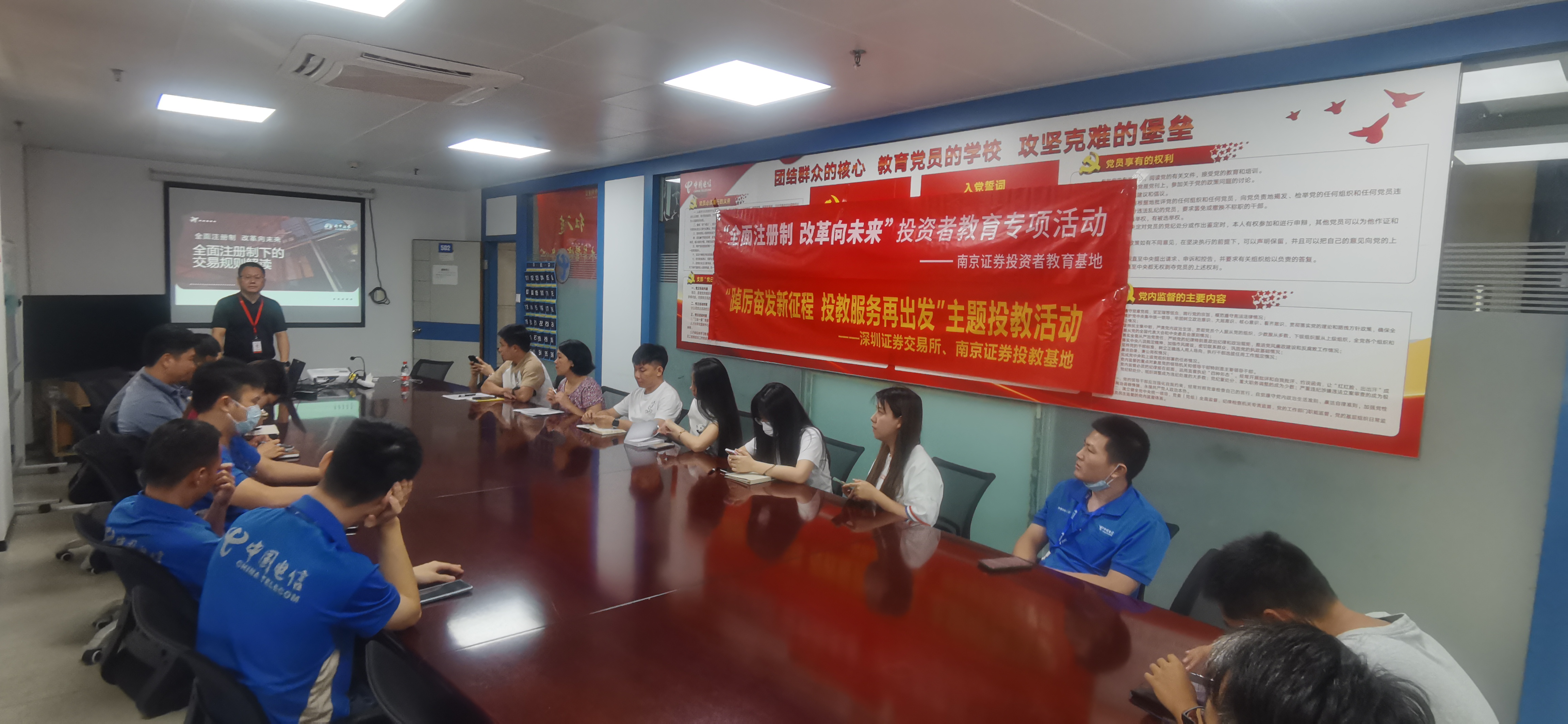为深入贯彻落实全面注册制改革,做好投资者合法权益保护工作,助力资本市场平稳健康发展,2023年11月6日,南京证券投资者教育基地联合深圳深南中路证券营业部走进深圳电信股份有限公司,开展了主题为“全面注册制 改革向未来”的投资者教育活动。