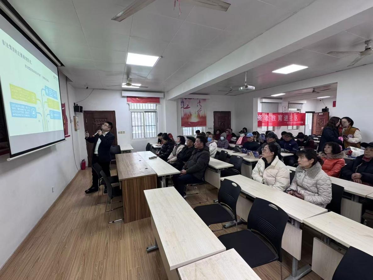 活动中,讲师围绕非法集资的常见类型、典型特征及社会危害进行了系统讲解,结合真实案例生动剖析了“高息诱惑”“养老投资”“虚拟货币”等非法集资常见套路,帮助居民认清非法金融活动的本质。在互动交流环节,居民们踊跃提问,就日常生活中遇到的各类可疑投资信息与工作人员进行了深入探讨,现场气氛热烈融洽。