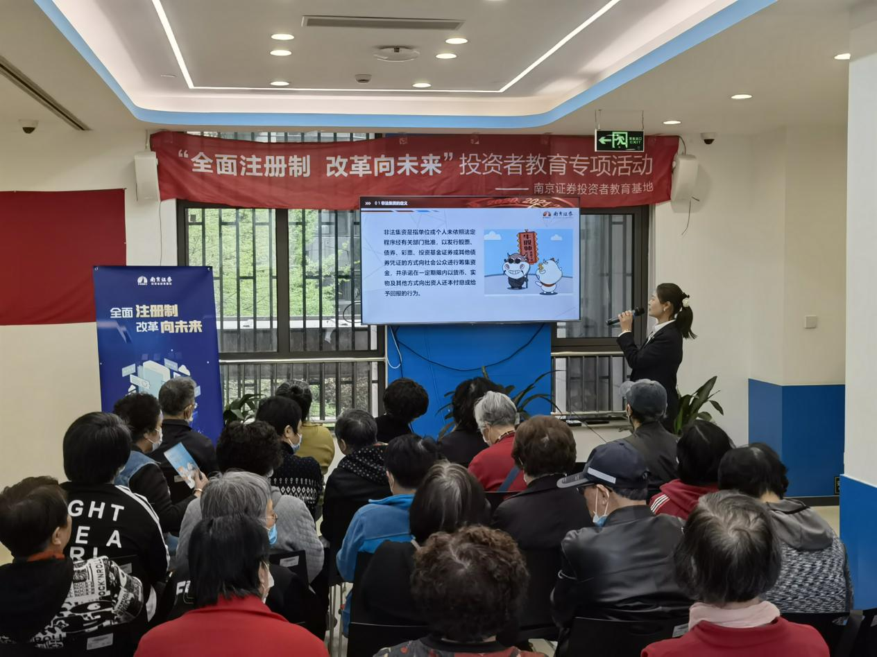 为积极推进全面实行股票发行注册制改革,持续提高投资者理性投资水平和风险防范意识,普及投资者对于注册制的认识,2023年4月14日,南京证券投资者教育基地联合上海南车站路营业部走进走进半凇园路街道迎勋居委,开展了“全面注册制 改革向未来”专项投资者教育活动。