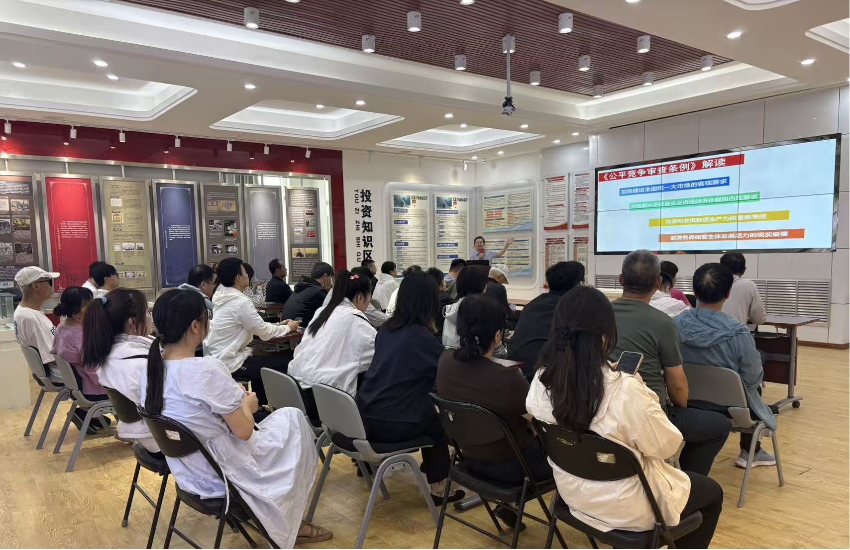 活动开始前,工作人员播放了《统一大市场 公平竞未来——2025年中国公平竞争政策宣传周》公益宣传片,生动传递“统一大市场 公平竞未来”的主题理念,有效增强全社会对公平竞争的价值认同和参与意识,使公平竞争理念进一步深入人心。讲师首先系统讲解了《公平竞争审查条例》的核心框架,并深入阐释了该条例出台的背景意义与社会影响,帮助投资者全面、准确地理解这部重要法规的实质内涵。